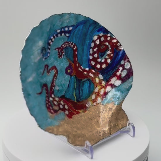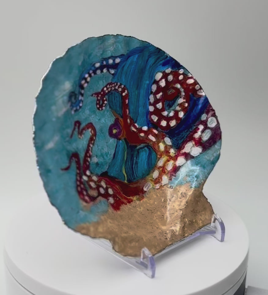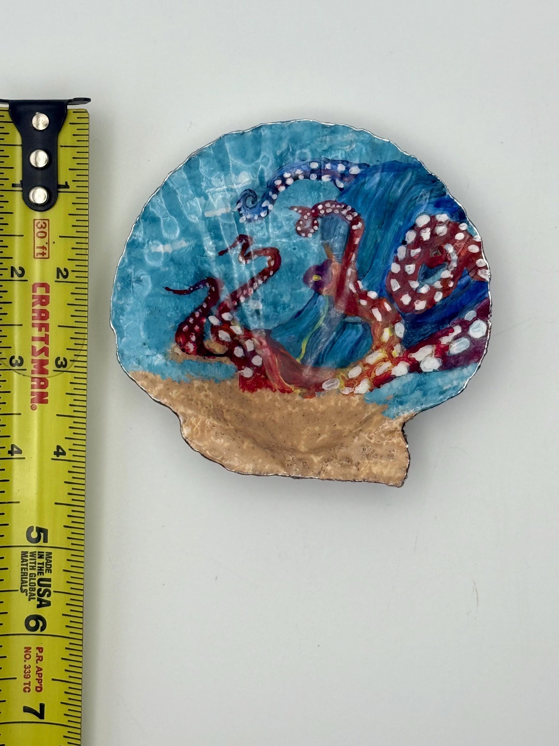 This striking hand-painted scallop shell brings the mystery of the deep sea to life. Featuring a vivid red octopus with curling tentacles against an ocean-blue backdrop, it’s finished with resin on both sides for a glossy, protective shine.